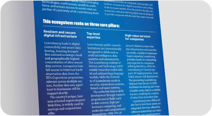14 crossroads magazine Luxembourg provides an integrated, interoperable and resilient ecosystem for digital innovation and scaling in the European market. Over the past few decades, the country has cultivated a thriving digital network designed to provide companies with the tools they need to succeed. For a nation to remain at the forefront of digi- tal innovation, it must rapidly adopt emerging technologies, continuously upskill its work- force, and ensure access to world-class ex- pertise. It’s precisely what Luxembourg does. BY LENA MÅRTENSSON Resilient and secure digital infrastructure Luxembourg leads in digital connectivity and secure data hosting, boasting Europe’s first national sovereign cloud and geographically highest concentration of ultra-secure data centres. Companies have full access to historical Earth observation data from the EU’s Copernicus programme, relevant across multiple sec- tors. Further data sets signif- icant to businesses will be mapped shortly. The country’s unique, busi- ness-oriented supercomputer MeluXina, is widely used by startups and corporations alike. High-value services for companies Several initiatives ensure that this infrastructure and expertise are readily available to businesses. Supercomputing Luxembourg provides hands-on onboarding and expertise to companies utilising MeluXina, while the Luxembourg AI Factory sup- ports AI implementation, from initial steps to full deployment. The pioneering Luxembourg National Data Service (LNDS) facilitates the sharing and reuse of public sector data in a reliable manner, enabling the creation of value from secondary data. Luxembourg’s true differenti- ator lies in how these assets are integrated. Services offered by different stakeholders are inter- operable and complementary, enabling businesses to utilise and benefit from them quickly and efficiently. Top-level expertise Luxembourg’s public research institutions are internationally recognised in fields such as artificial intelligence, data analytics and cybersecurity. The Luxembourg Institute of Science and Technology (LIST) notably researches explainable AI and unbiased large language models, while the Universi- ty of Luxembourg excels in security, autonomous systems, fintech and space systems. The university fosters skills development through master’s programmes in fields such as data science, high-per- formance computing, and molecular and computational biomedicine. With 75% of its workforce being foreign nationals, Luxembourg is also a magnet for global talent. 14 crossroads magazine