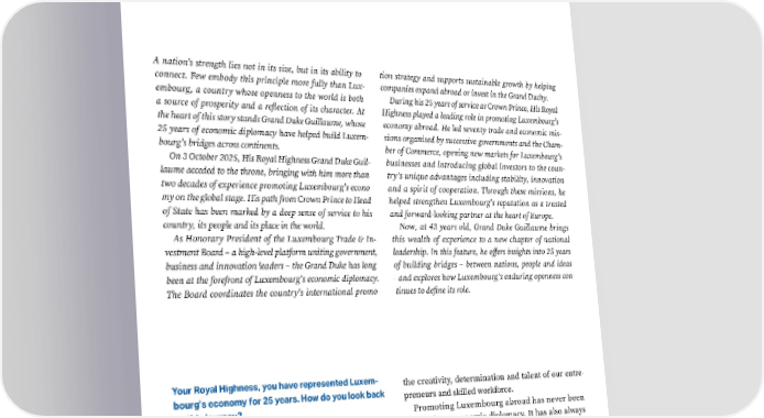 5 autumn 2025 Your Royal Highness, you have represented Luxem- bourg’s economy for 25 years. How do you look back on this journey? H.R.H. the Grand Duke: These 25 years have been a journey of service and gratitude, one that showed me how deeply Luxembourg’s openness inspires trust and collaboration around the world. Every mission and every encounter has been an opportunity to witness A nation’s strength lies not in its size, but in its ability to connect. Few embody this principle more fully than Lux- embourg, a country whose openness to the world is both a source of prosperity and a reflection of its character. At the heart of this story stands Grand Duke Guillaume, whose 25 years of economic diplomacy have helped build Luxem- bourg’s bridges across continents. On 3 October 2025, His Royal Highness Grand Duke Guil- laume acceded to the throne, bringing with him more than two decades of experience promoting Luxembourg’s econo- my on the global stage. His path from Crown Prince to Head of State has been marked by a deep sense of service to his country, its people and its place in the world. As Honorary President of the Luxembourg Trade & In- vestment Board – a high-level platform uniting government, business and innovation leaders – the Grand Duke has long been at the forefront of Luxembourg’s economic diplomacy. The Board coordinates the country’s international promo- the creativity, determination and talent of our entre- preneurs and skilled workforce. Promoting Luxembourg abroad has never been solely about economic diplomacy. It has also always been about human connections. Our success is built on trust, enduring partnerships, and a shared belief that even small nations like ours can have a global im- pact when we act with integrity, openness and vision. tion strategy and supports sustainable growth by helping companies expand abroad or invest in the Grand Duchy. During his 25 years of service as Crown Prince, His Royal Highness played a leading role in promoting Luxembourg’s economy abroad. He led seventy trade and economic mis- sions organised by successive governments and the Cham- ber of Commerce, opening new markets for Luxembourg’s businesses and introducing global investors to the coun- try’s unique advantages including stability, innovation and a spirit of cooperation. Through these missions, he helped strengthen Luxembourg’s reputation as a trusted and forward-looking partner at the heart of Europe. Now, at 43 years old, Grand Duke Guillaume brings this wealth of experience to a new chapter of national leadership. In this feature, he offers insights into 25 years of building bridges – between nations, people and ideas – and explores how Luxembourg’s enduring openness con- tinues to define its role. His Royal Highness Grand Duke Guillaume reflects on 25 years of promoting Luxem- bourg’s economy, its unique openness to the world, and the enduring values that guide the Grand Duchy. A VISION FOR LUXEMBOURG