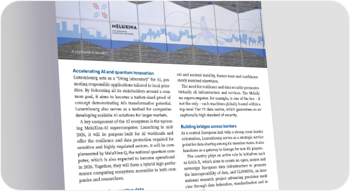 15 autumn 2025 Accelerating AI and quantum innovation Luxembourg acts as a “living laboratory” for AI, pro- moting responsible applications tailored to local prior- ities. By federating all its stakeholders around a com- mon goal, it aims to become a nation-sized proof of concept demonstrating AI’s transformative potential. Luxembourg also serves as a testbed for companies developing scalable AI solutions for larger markets. A key component of the AI ecosystem is the upcom- ing MeluXina-AI supercomputer. Launching in mid- 2026, it will be purpose-built for AI workloads and offer the resilience and data protection required for sensitive and highly regulated sectors. It will be com- plemented by MeluXina-Q, the national quantum com- puter, which is also expected to become operational in 2026. Together, they will form a hybrid high-perfor- mance computing ecosystem accessible to both com- panies and researchers. A safe haven for sensitive data A distinctive characteristic of Luxembourg is the state’s active role in shaping the digital future. It strategically funds and supports key initiatives such as high-perfor- mance computing and sovereign cloud services. This long-term vision, closely tied to Luxembourg’s politi- cal and societal stability, fosters trust and confidence rarely matched elsewhere. The need for resilience and data security permeates virtually all infrastructure and services. The MeluXi- na supercomputer, for example, is one of the few – if not the only – such machines globally hosted within a top-level Tier IV data centre, which guarantees an ex- ceptionally high standard of security. Building bridges across borders As a central European hub with a strong cross-border orientation, Luxembourg serves as a strategic service point for data sharing among EU member states. It also functions as a gateway to Europe for non-EU players. The country plays an active role in initiatives such as GAIA-X, which aims to create an open, secure and sovereign European data infrastructure to promote the interoperability of data, and CLINNOVA, an inter- national research project advancing precision medi- cine through data federation, standardisation and in- teroperability. With its integrated strengths, forward-looking vision and steadfast commitment to trust and excellence, Lux- embourg stands out as the ideal launchpad for digital innovation and scalable success across Europe. DATA, AI AND QUANTUM © LuxProvide & EuroHPC