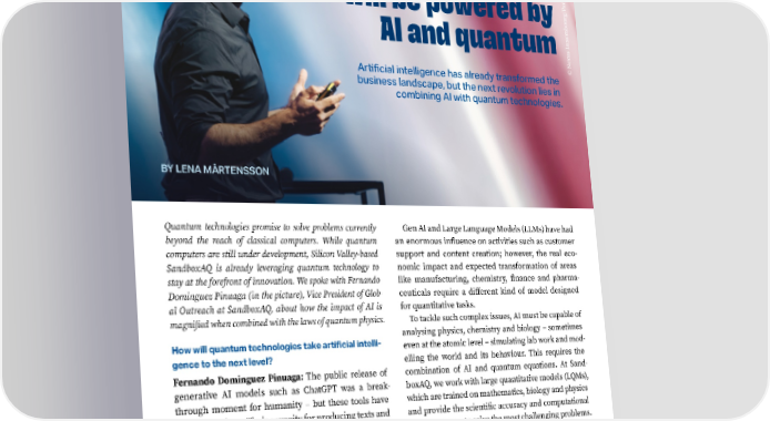 12 crossroads magazine Quantum technologies promise to solve problems currently beyond the reach of classical computers. While quantum computers are still under development, Silicon Valley-based SandboxAQ is already leveraging quantum technology to stay at the forefront of innovation. We spoke with Fernando Dominguez Pinuaga (in the picture), Vice President of Glob- al Outreach at SandboxAQ, about how the impact of AI is magnified when combined with the laws of quantum physics. How will quantum technologies take artificial intelli- gence to the next level? Fernando Dominguez Pinuaga: The public release of generative AI models such as ChatGPT was a break- through moment for humanity – but these tools have their limitations. Their capacity for producing texts and images is impressive, but in fact, they perform pure- ly statistical analyses of the data on which they have been pretrained. If you are looking for the key to curing Alzheimer’s, they won’t be able to help you because the answer isn’t something you can simply find online. Gen AI and Large Language Models (LLMs) have had an enormous influence on activities such as customer support and content creation; however, the real eco- nomic impact and expected transformation of areas like manufacturing, chemistry, finance and pharma- ceuticals require a different kind of model designed for quantitative tasks. To tackle such complex issues, AI must be capable of analysing physics, chemistry and biology – sometimes even at the atomic level – simulating lab work and mod- elling the world and its behaviour. This requires the combination of AI and quantum equations. At Sand- boxAQ, we work with large quantitative models (LQMs), which are trained on mathematics, biology and physics and provide the scientific accuracy and computational scale necessary to solve the most challenging problems. When working with diseases such as Alzheimer’s, we begin by using an LLM within the LQM to analyse all available information, including research papers, clinical trial results, data about genes and proteins, Artificial intelligence has already transformed the business landscape, but the next revolution lies in combining AI with quantum technologies. BY LENA MÅRTENSSON © Nexus Luxembourg/Pancake! Photographie