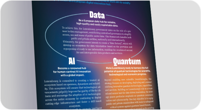 DATA, AI AND QUANTUM Three complementary government strategies published in 2025 aim to solidify Luxembourg’s position as a European digital innovation hub. Luxembourg is committed to creating a trusted AI ecosystem based on openness, dynamism and reliabil- ity. This ecosystem will ensure that technological ad- vancements palpably improve the quality of life for cit- izens and encourage the adoption of AI technologies across the entire economy by continuing to deploy cutting-edge infrastructure and foster a skill-based ecosystem. The government also intends to promote intelligent and efficient processes and personalised, inclusive public services. It will continue to build a research ecosystem that positions AI as transversal and inter- disciplinary, driving innovation, and attracting inter- national and developing national talent. Beyond enabling new scientific breakthroughs, the strategy focuses on developing, deploying and commer- cialising innovative quantum technologies, capabilities and services. Building on Luxembourg’s role as a trust- ed and secure hub for data-driven innovation, the strat- egy places particular emphasis on quantum communi- cation and cybersecurity. One key objective is to equip public and private stakeholders with tools to safeguard critical systems against quantum-based threats. In parallel, the country seeks to expand on its existing strengths in high-performance computing and AI, lev- eraging the disruptive potential of quantum comput- ing to accelerate industrial transformation and main- tain technological competitiveness. To achieve this, the Luxembourg government takes on the role of a pio- neer in data management, establishing centralised governance to simplify access, use and reuse of public sector data. This framework benefits both public and private entities, nationally and internationally. Ultimately, the government intends to create a “data factory”, which will develop an ecosystem for data valorisation based on the provision and repurposing of ready-to-use information, enabling the creation of accessi- ble and interoperable data products and services. Be a European data hub for reliable, high-quality and easily exploitable data. Become a renowned hub for human-centred AI innovation with a global impact. Make Luxembourg ready to harness the full potential of quantum technologies for scientific, technological and economic progress. 17 autumn 2025